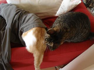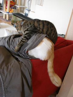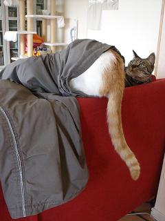 冬場は、飼い主♂がしょっちゅうソファーに脱いだ洋服を置いて