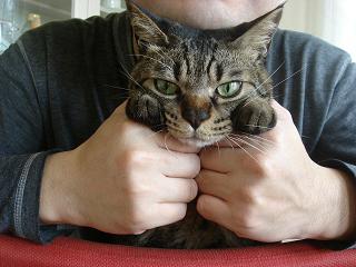 飼い主♂にむぎゅっと掴まれたショコラさん。